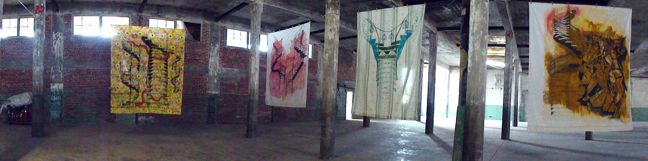 Cette troisième installation occupe de façon imposante l’espace industriel mis à nu. Elle provoque une réappropriation du lieu par des femmes, manière de boucler la boucle en y ramenant les draps ouvragés de ces artistes.